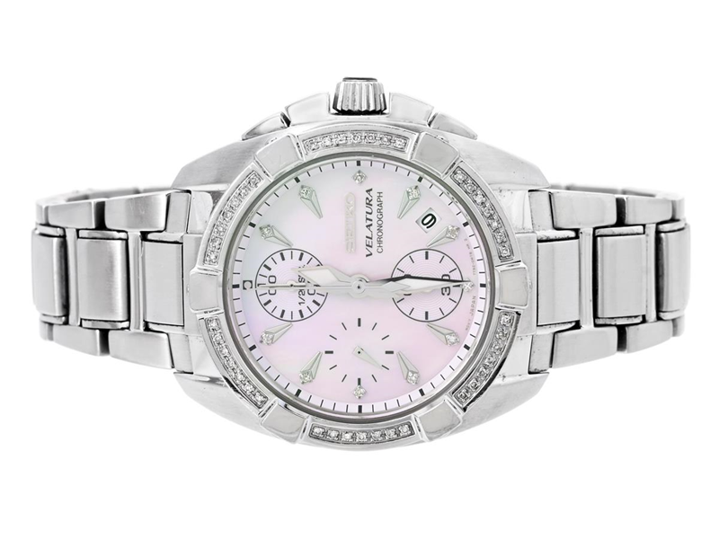 SEIKO, Velatura, Cal 7T92, Serie nr. 0O0213, Boett nr. 7T92-0JW0, kronograf, damur, 36 mm, stål, quartz, safirglas, datum, pärlemorurtavla med diamanter (11 st. 8/8), diamantkrans (42 st. 8/8, ca 0,15 ctv), originallänk, viklås, Ref nr. 4A551-D.C, ca 2010, box, ytterkartong.