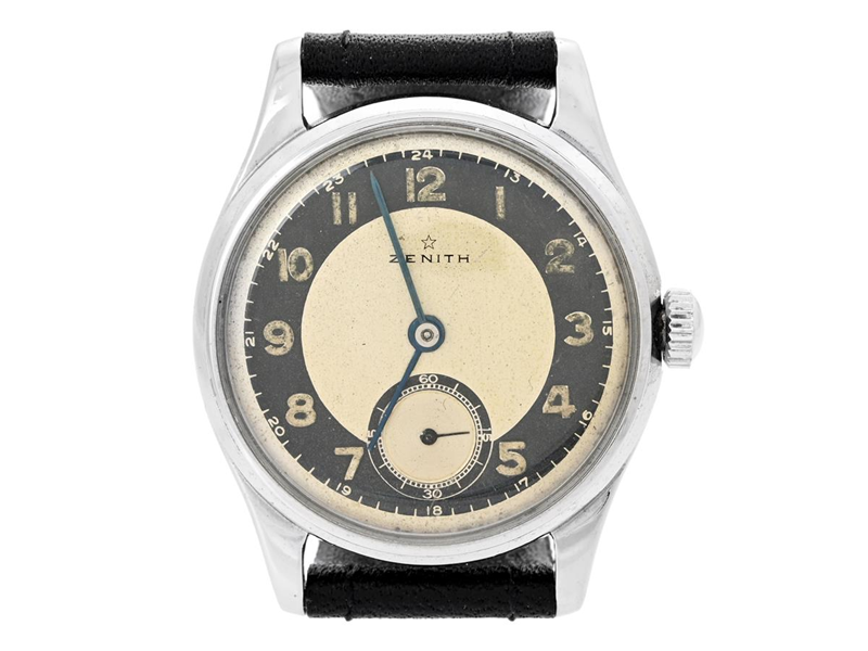 ZENITH, "Stötsäker", herrur, 29,5 mm, Cal 106 P-6, Serie nr. 3476971, Boett nr. 8421847, stål, manuell, plexiglas, liten sekundvisare, utbytta visare (avkortad), skadad urtavla, läderband, ca 1944.