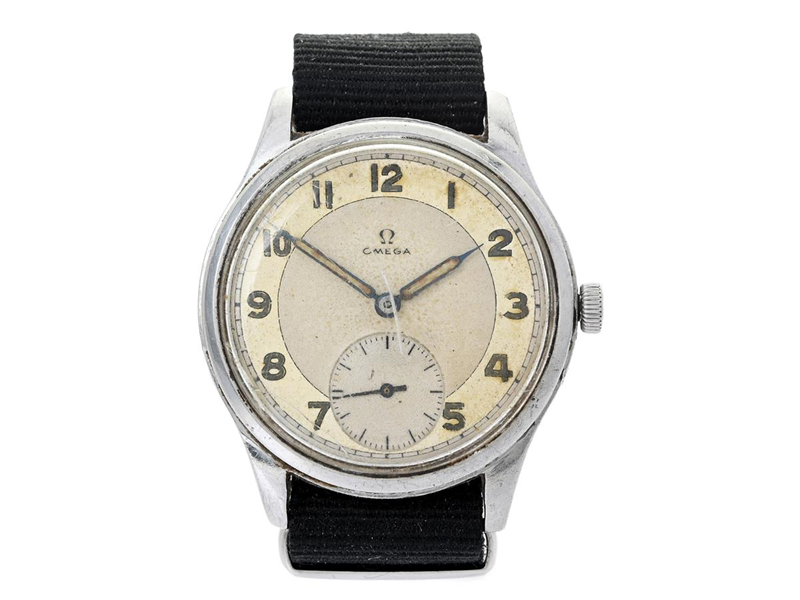 OMEGA, Suverän, Cal 30 T2 SC PC, Serie nr. 10369392, Ref nr. CK 2425, Boett nr. 2400-6 / 128, herrur, 35 mm, stål, manuell, plexiglas (skadat), liten sekundvisare, skadad urtavla, defekt (går ej, akut servicebehov), NATO-band, ca 1944.