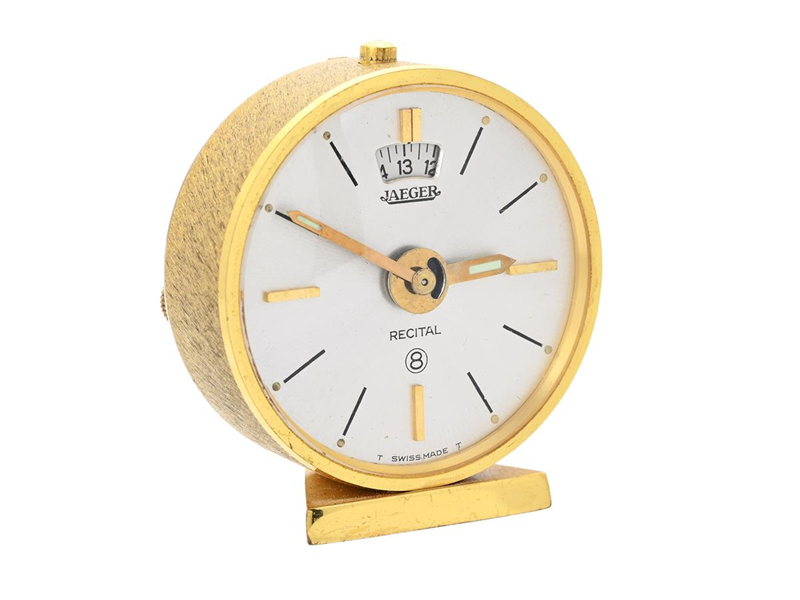 JAEGER, Recital (T Swiss Made T), väckarur, 46 x 49 mm, Boett nr. 101, gulmetall, mekanisk, 8-dagarsverk, alarm, ca 1965, fodral (skadat).