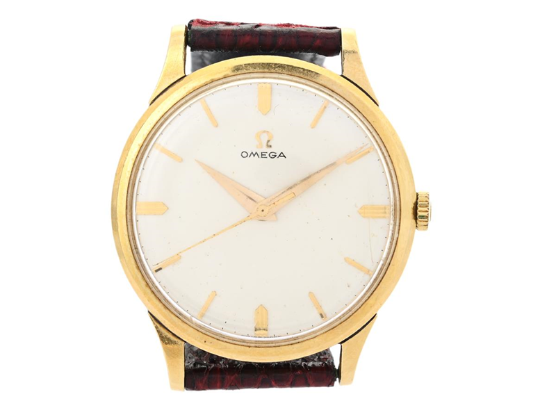 OMEGA, herrur, 35 mm, Cal 285, Serie nr. 18981816, Ref nr. OT 14708, Boett nr. 14708 61, 18K guld, manuell, plexiglas, skadad urtavla, skadad boett (böjt bandhorn), gravyr, läderband, ca 1961.