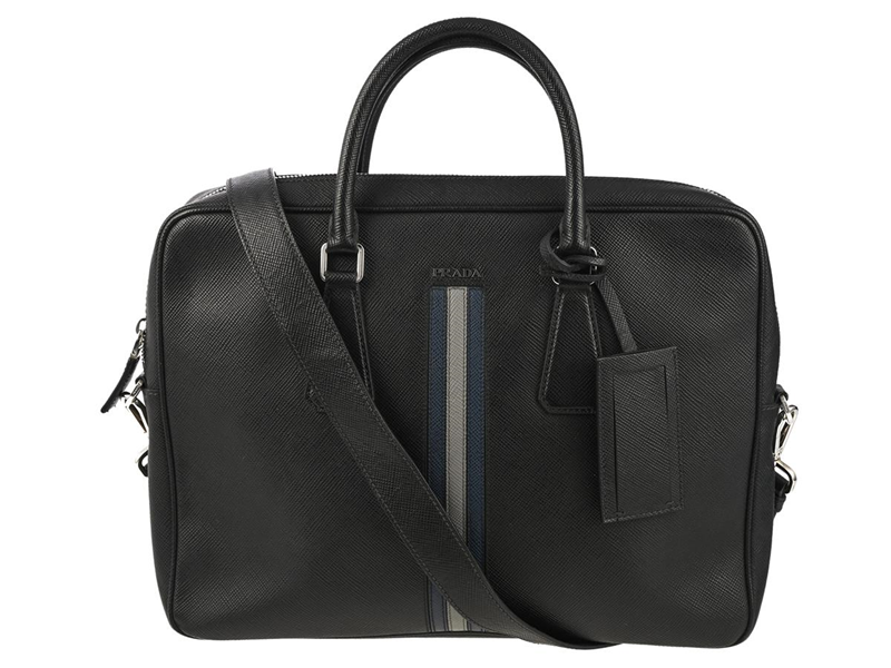 VÄSKA, PRADA, Striped Business Bag, svart, blått, grått saffiano läder, silverfärgade beslag, 36x28x6 cm, avtagbar axelrem, dustbag.