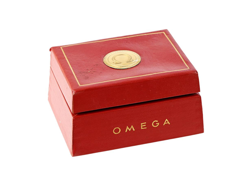 BOX, till Omega damur, röd, 105 x 83 x 53 mm, ej komplett, skadad, ca 1955.