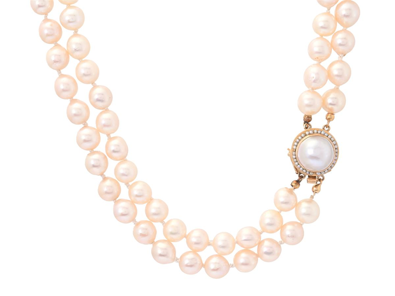 ENGELBERT, pärlcollier, 2-radigt, odlade pärlor ca 7,5 mm, lås i 18K guld, pärlor, Stigbert, Stockholm 1968, längd 39 cm.