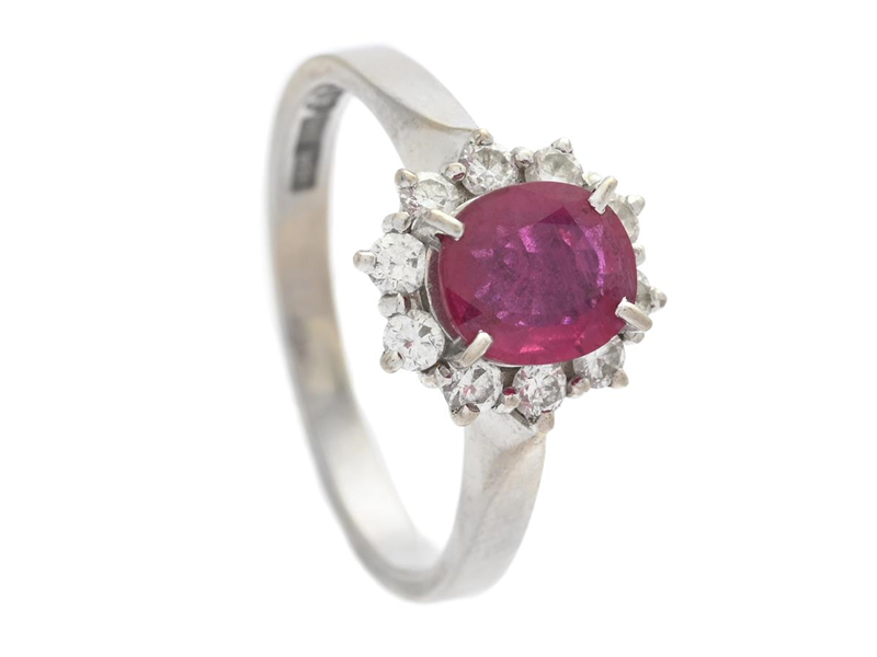 CARMOSÉRING, 18K vitguld, ovalslipad rubin 0,97 ct, 10 briljantslipade diamanter 0,30 ctv, ca TW/VS, Stigbert, Stockholm 1984, stl 16,25 mm, vikt 3,8 g.