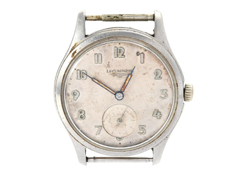 LONGINES, herrur, 35 mm, Cal 12.68Z, Serie nr. 10651413, Boett nr. 6263 17 / 53, stål, manuell, plexiglas, liten sekundvisare, skadad urtavla, defekt, skadad krona/ställaxel, ca 1957.