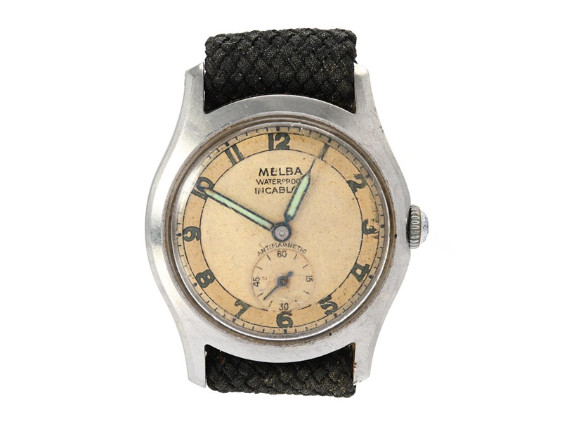 MELBA, herrur, 33 mm, stål, manuell, plexiglas, liten sekundvisare, skadad urtavla, perlonband, ca 1945.