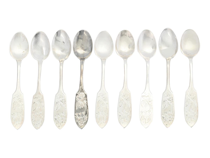 MOCCASKEDAR, silver, 11 stycken, motiv med olika blommor, längd 10 cm, vikt 98,5 g.