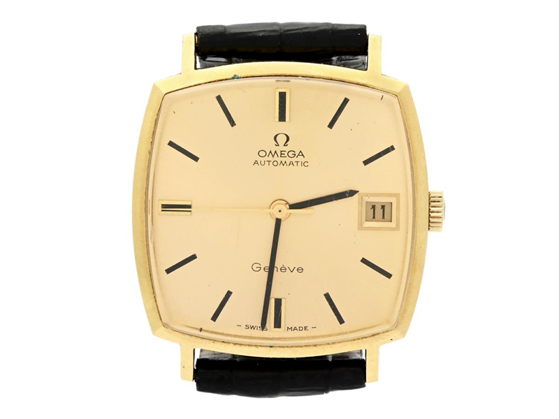 OMEGA, Genève, Cal 565, Serie nr. 33046390, Ref nr. BA 162.010, Boett nr. 162.010, herrur, 31 x 31 (37) mm, 18K guld, automatisk, plexiglas, datum, läderband, ca 1971.