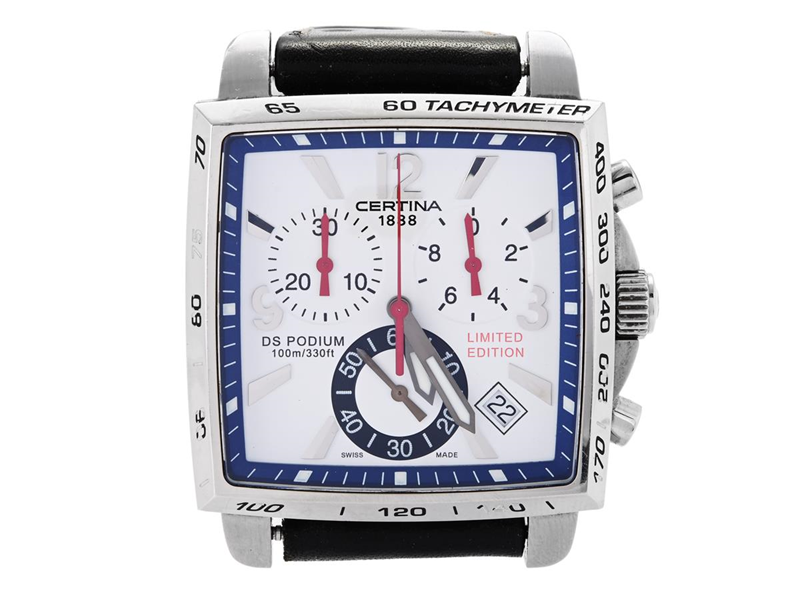 CERTINA, DS Podium Square (100m/330ft), "BMW Sauber F1 Team", "Tachymeter", Ref nr. C001.517.16.017.00, kronograf, herrur, 38 x 38 (49) mm, stål, quartz, safirglas, datum, läderband, ca 2007. box (skadad), ytterkartong, Limiterad och numrerad (Nr. 2111/3150).
