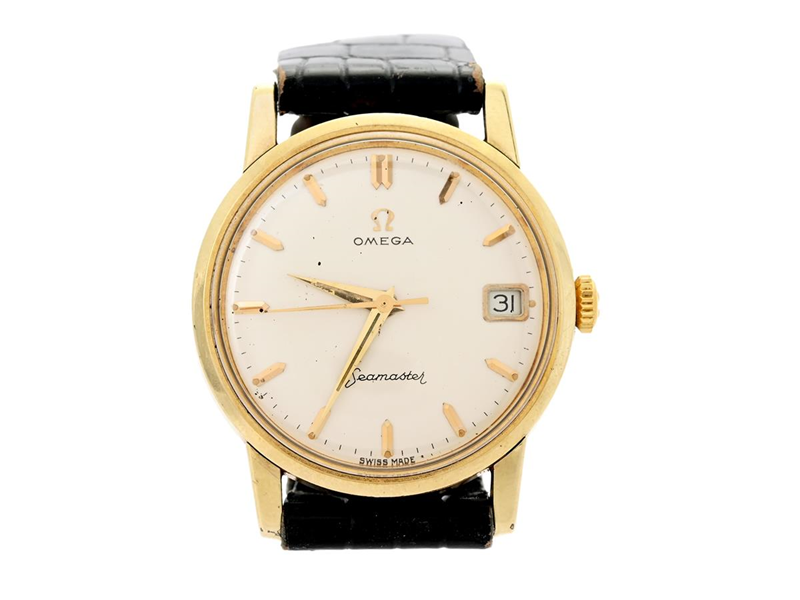 OMEGA, Seamaster (Swiss Made), Cal 610, Serie nr. 19105345, Ref nr. KO 14384, Boett nr. 14384 61 SC (C.B), herrur, 33,5 mm, guld på stål, manuell, plexiglas, datum, läderband, ca 1961.