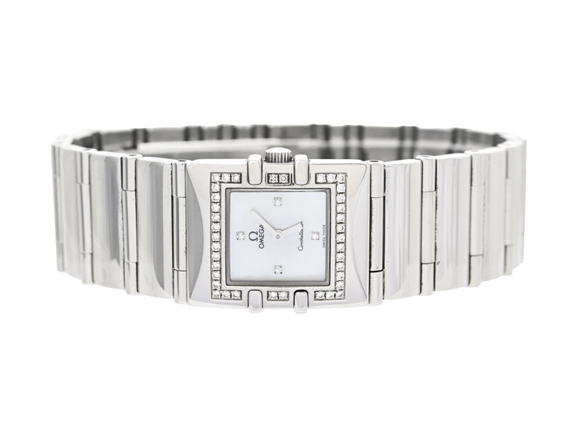 OMEGA, Constellation, Quadra, Cal 1376, Serie nr. 57134980, PIC nr. 1528.76.00, Ref nr. ST 895.1230, Boett nr. 895.1230, damur, 19 x 24 mm, stål, quartz, safirglas (repor/nagg), pärlemorurtavla med diamanter (4 st. 8/8), briljantkrans (38 st. TW/VVS, ca 0,23 ctv), integrerad originallänk, viklås, Ref nr. 6554/866, cert (ej komplett), ca 2000, etui.
