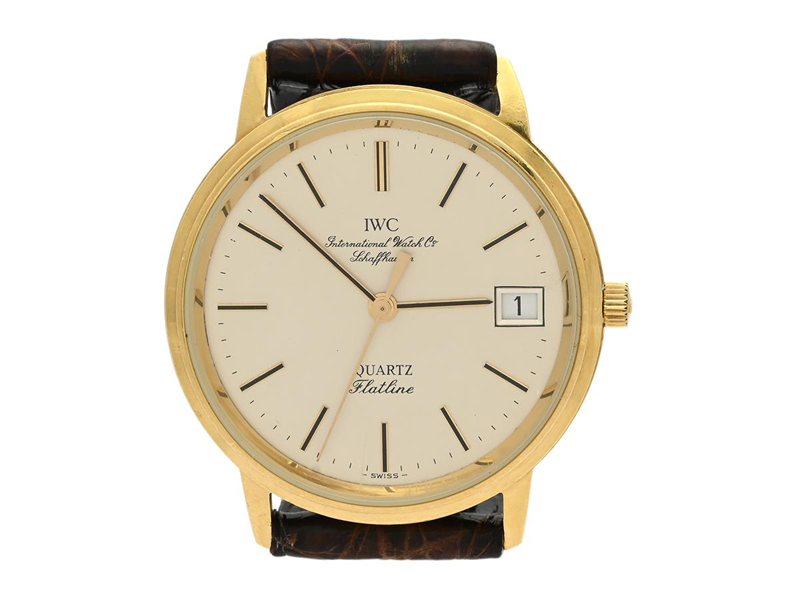 IWC, International Watch Co, Schaffhausen, Flatline, Boett nr. 3306 / 2333154, herrur, 33 mm, 18K guld, quartz, mineralglas, datum, urverk ej signerat, gravyr, läderband, ca 1984.