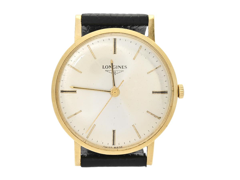 LONGINES, herrur, 34 mm, Cal 280, Serie nr. 13445186, Boett nr. 7785 1 / 1744, 18K guld, manuell, plexiglas, skadad urtavla, gravyr, läderband, ca 1966.