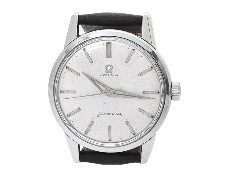 OMEGA, Seamaster, Cal 285, Serie nr. 18406169, Ref nr. CK 14390, Boett nr. 14390-9-SC (CSP), herrur, 35 mm, stål, manuell, plexiglas, relumade visare, skadad urtavla, defekt (går ej, akut servicebehov), skadad boett, läderband, ca 1961.