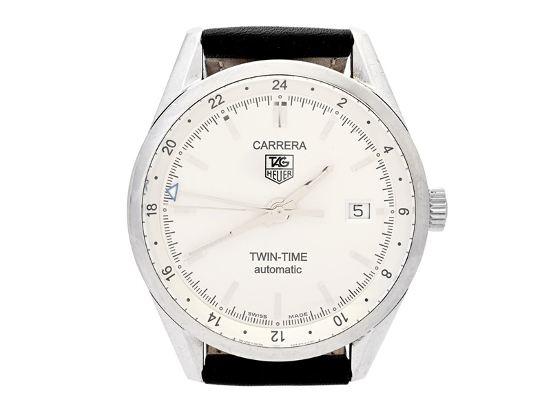 TAG HEUER, Carrera, Twin-Time, Cal 7 (ETA 2893-2), Serie nr. TN9616, Boett nr. WV2116, herrur, 39 mm, stål, automatisk, safirglas (repor), datum, 24-timmarsvisning, läderband, viklås, Ref nr. FC 5014/F A1, ca 2003, serviceetui (ej komplett).