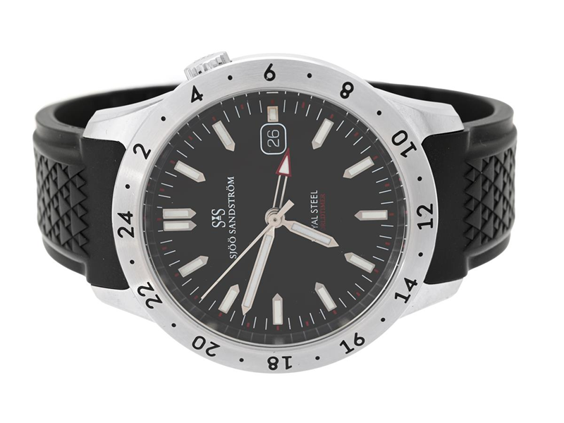 SJÖÖ SANDSTRÖM, Royal Steel, Worldtimer, Cal SS G14 (ETA 2893-2), Serie nr. 291, Boett nr. SS-1741-WT, herrur, 41 mm, stål, automatisk, safirglas, datum, 24-timmarsvisning, glasbaksida, integrerat gummiband, viklås, cert, april 2018, box, ytterkartong.