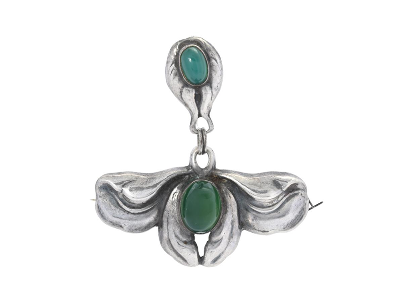 BERNARD HERTZ, brosch, silver, grön kalcedon, 1917, Jugend, mått 60x55 mm, vikt 10,8 g.