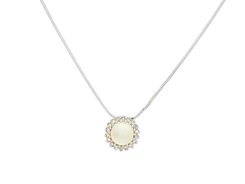 HÄNGE MED KEDJA, 18K vitguld, buttonformad odlad pärla 5,0 mm, åttkantslipade diamanter, höjd 7,8 mm, längd på kedja ca 42 cm, vikt 2,9 g.