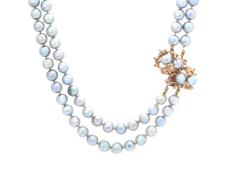 PÄRLCOLLIER, lås 14K guld, 2- radig, färgade odlade pärlor, längd 58 cm, vikt 127,2 g. sliitet silke.