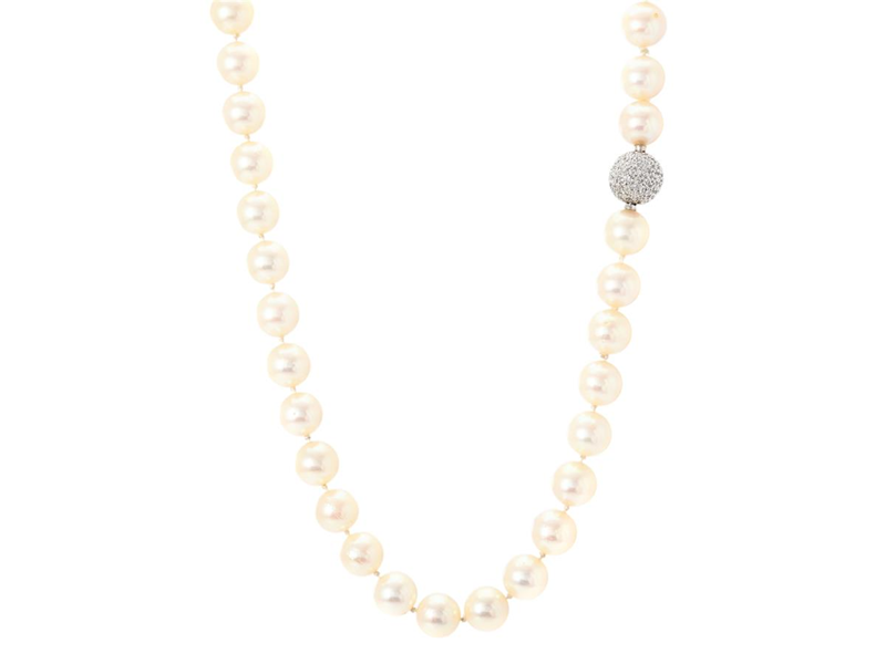 PÄRLCOLLIER, odlade saltvattenpärlor ca 9,0 mm, bajonettlås i 18K vitguld, briljantslipade diamanter ca 0,72 ctv, ca TW-W/VS-SI, längd 49,0 cm, vikt 54,4 g, ytfel på pärlorna.