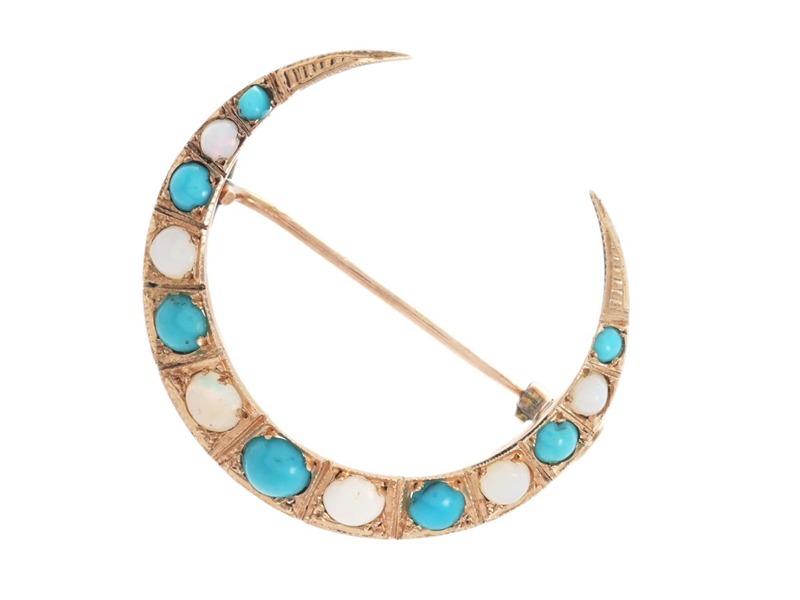 BROSCH, månskära, 14K guld, opaler, turkoser, vikt 4,0 g.