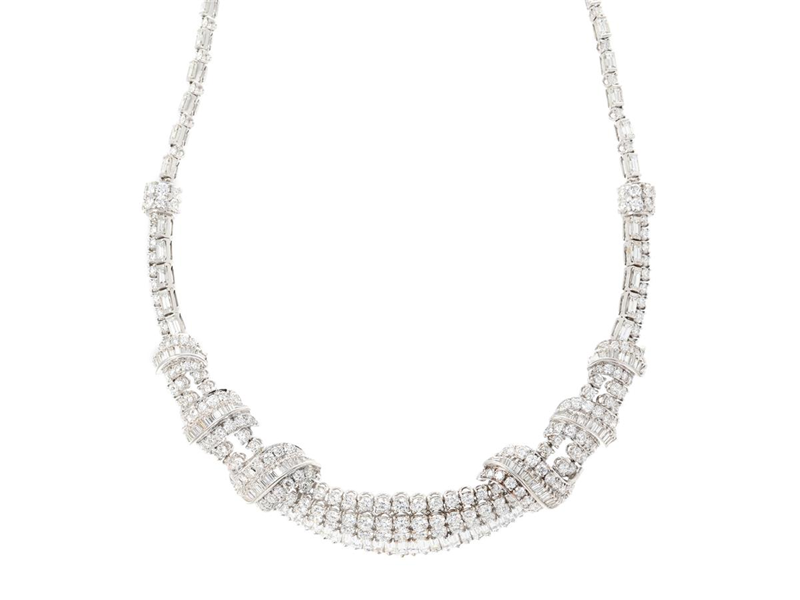 COLLIER, 18K vitguld, 167 baguette- och 200 briljantslipade diamanter ca 24,00 ctv, ca R-TCr/VVS-VS, längd 41 cm, vikt 72,3 g, enstaka diamanter har nagg och små skador.