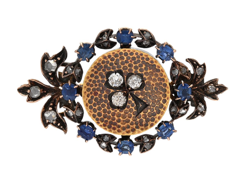 BROSCH, 18K guld/silver, treklöver, safirer, antik och rosenslipade diamanter, antik, 1800-talets slut, 18x30 mm, vikt 3,8 g, några stenar med nagg.
