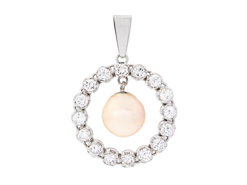 HÄNGE, 18K vitguld, odlad pärla ca 9,3 mm, 16 briljantslipade diamanter ca 1,12 ctv, ca TW-W/VS, Kaplans Safir, Stockholm, höjd 30 mm,vikt 6,1 g, några diamanter med nagg på kuletten.