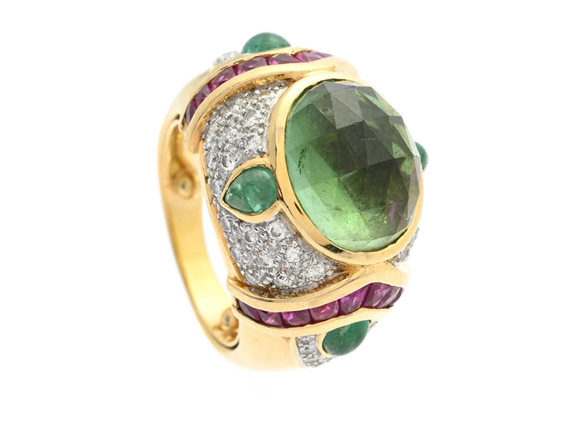 RING, 18K guld, grön turmalin, smaragder, rubiner, briljantslipade diamanter ca 0,60 ctv, ca TW/VS, stl ca 15 mm, vikt 14,6 g, storleksändrad med pålödda kulor i ringskenan.