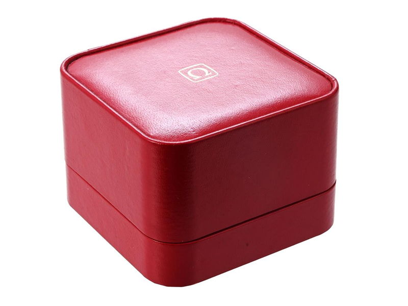 BOX, till Omega armbandsur, röd, 90 x 90 x 63 mm, skadad, ca 1980.
