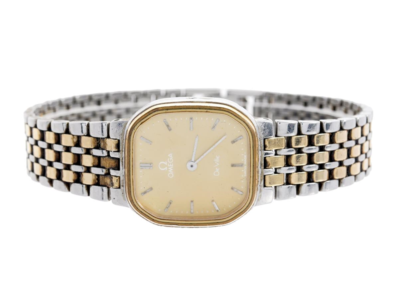 OMEGA, De Ville, Cal 1387, Serie nr. 45754759, Boett nr. 595.0038/795.0823 (LL), damur, 21 mm, bicolour, quartz, mineralglas, skadad urtavla, integrerad originallänk, längd 168 mm, ca 1983.