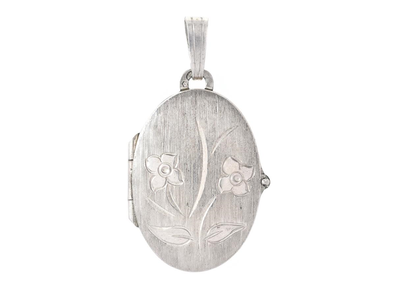 MEDALJONG, silver, oval, graverade blommor på, längd 3 cm, med plats för två foton, vikt 6,2 g.