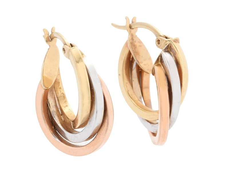 ÖRRINGAR, 14K trefärgat guld, ytterdiameter ca 16,1 mm, stängbara stift, vikt ca 2,6 g.