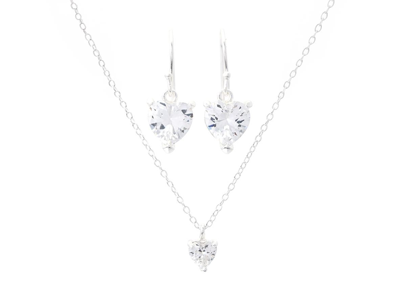 SMYCKESET, 1 collier, 1 par örhängen, sterlingsilver, cubic zirconia, hjärtan, krokar, vikt ca 4,1 g.