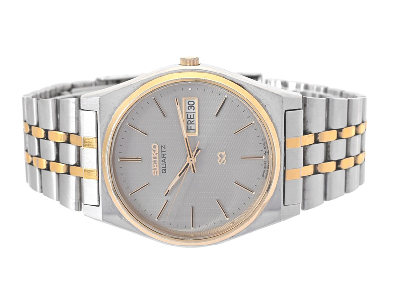 SEIKO, SQ, Cal 5H23, Serie nr. 610602, Boett nr. 5H23-8000, herrur, 35 mm, bicolour, quartz (går ej), hardlexglas, dag, datum, skadad urtavla, originallänk, viklås, ca 1986.