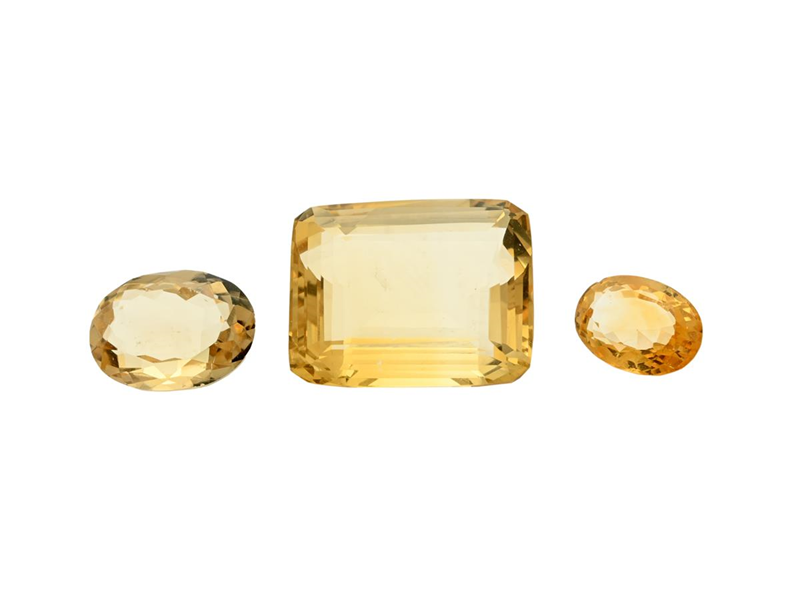 3 CITRINER, 2 st ovalslipade och en större smaragdslipad, ca 84,5 ctv. den mindre ovala med ett nagg och den större ovalslipade med flera små nagg.