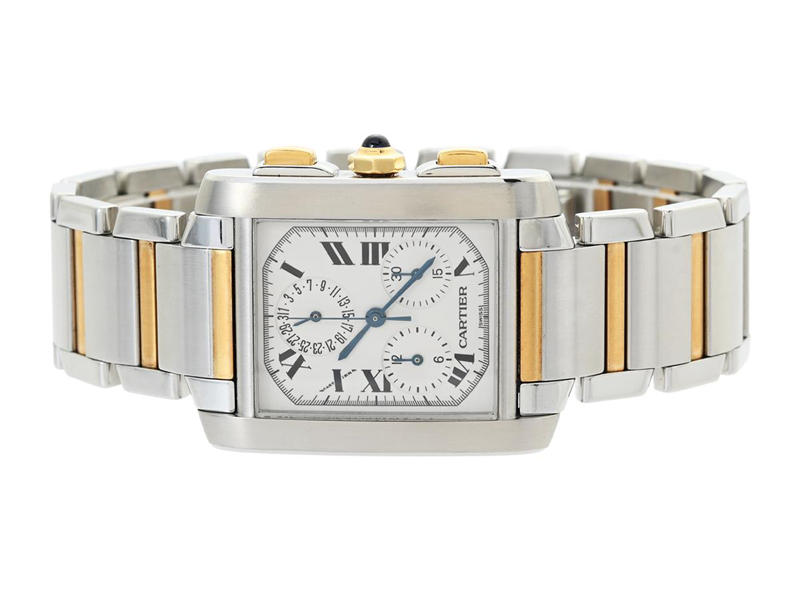 CARTIER, Tank Francaise, Cal 212 P, Ref nr. W51001Q4, Boett nr. BB303006 / 2303, kronograf, herrur, 28 x 28 (36) mm, stål/guld, quartz (Chronoreflex), safirglas, datum, originallänk, viklås, Ref nr. UFEB, cert, januari 2000, box (skadad)