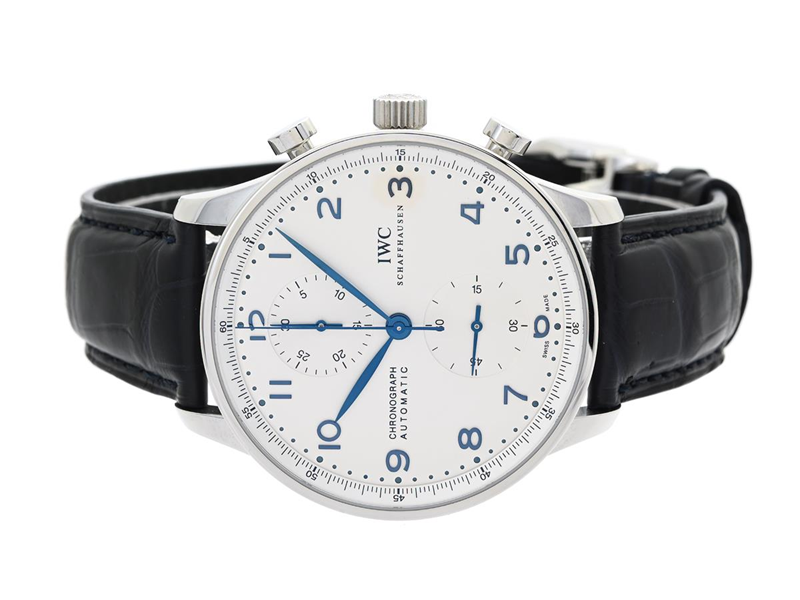 IWC, Schaffhausen, Portuguese, Cal 79350, Ref nr. 371446, Boett nr. 5279638, kronograf, herrur, 40,9 mm, stål, automatisk, safirglas, läderband, viklås, cert, april 2015, box.