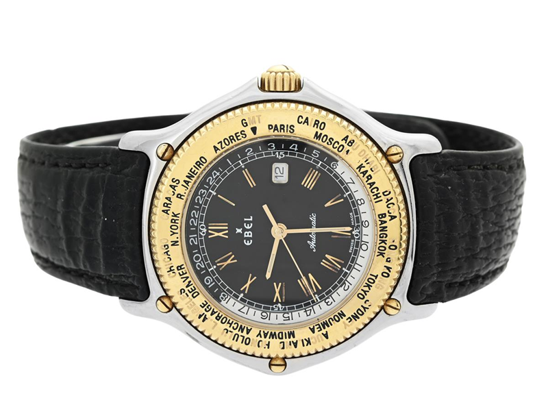 EBEL, Voyager, Cal 124 (ETA 2892A2), Serie nr. 34601872, Ref nr. 1124913, herrur, 39 mm, stål/guld, automatisk, safirglas, världstidsvisning, skadad urtavla, integrerat läderband, viklås, cert, maj 1990.