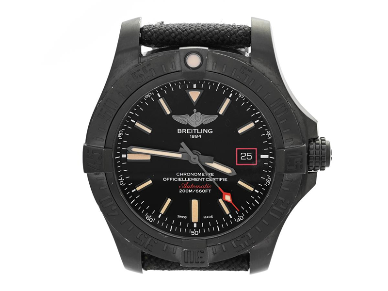 BREITLING, Avenger Blackbird 44 (200M/660FT), Chronometre, Cal B17 (ETA 2824-2), Verk nr. 1733415, Serie nr. 1733412, Ref nr. V1731110, Boett nr. 1215 B5, herrur, 44 mm, svart titan, automatisk, safirglas, datum, tygband, originalspänne i svart stål, cert, september 2015, box, ytterkartong.