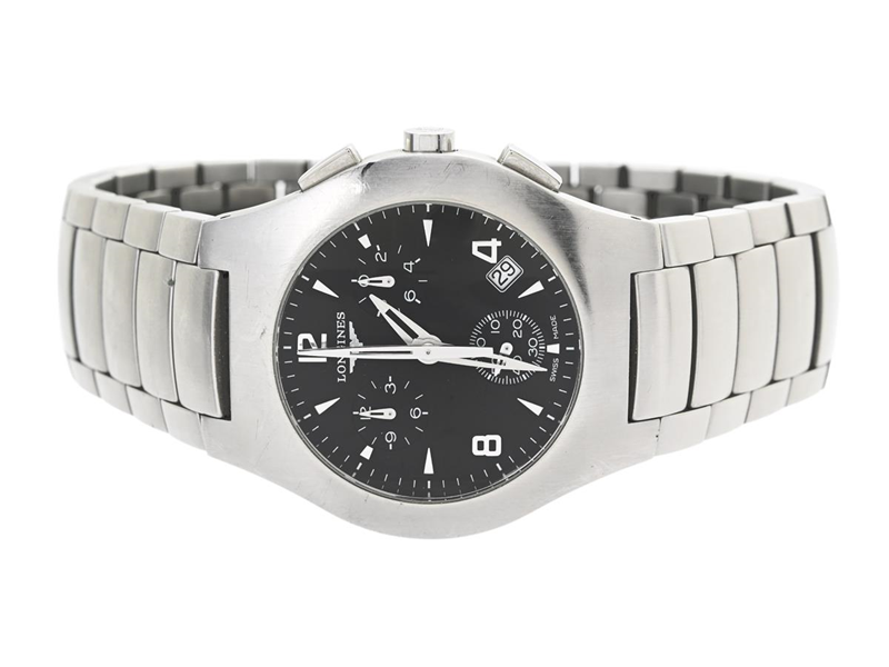 LONGINES, Oposition, Serie nr. 31487903, Ref nr. L3.618.4.56.6, kronograf, herrur, 38 mm, stål, quartz, safirglas, datum, integrerad originallänk, viklås, Ref nr. 07 27716, cert, februari 2004, box (skadad).