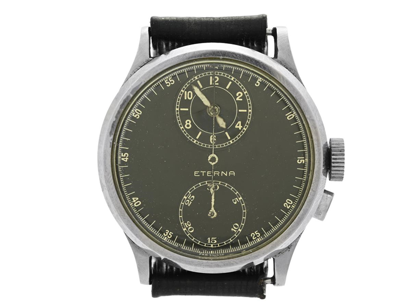 ETERNA, enknappskronograf, Cal , Serie nr. 2679241, Boett nr. 2416856, herrur, 33,5 mm, stål (Satybrite), manuell, plexiglas, skadad urtavla, fasta bandstift, läderband, ca 1936.