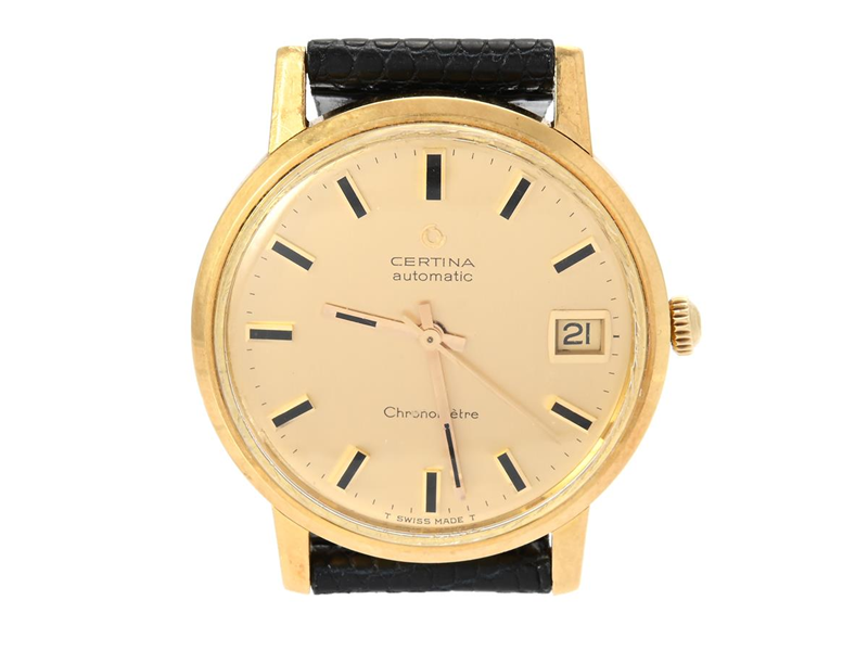 CERTINA, Chronomètre (T Swiss Made T), Cal 25-651, Verk nr. 101914, Serie nr. 580102, Boett nr. 5810.200, herrur, 35 mm, 18K guld, automatisk, plexiglas (skadat), datum, skadad urtavla, läderband, originalspänne i doublé, ca 1969, box.