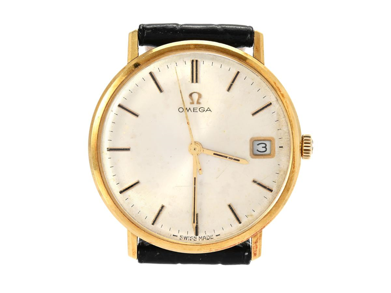 OMEGA, herrur, 33 mm, Cal 611, Serie nr. 23716182, Ref nr. BA 132.0026, Boett nr. 132.026, 18K guld, manuell, plexiglas (skadat), datum, skadad urtavla/visare, läderband, ca 1966.