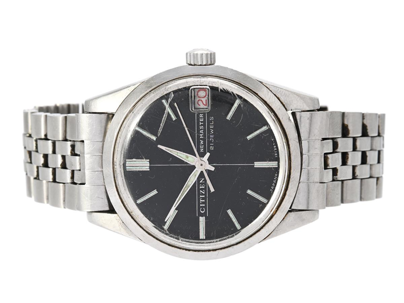 CITIZEN, New Master, Cal 1802, Serie nr. 10831238, Boett nr. 4-18615 Y / 63-1019, herrur, 35 mm, stål, manuell, plexiglas (skadat), datum, skadad urtavla, originallänk, viklås, ca 1961.