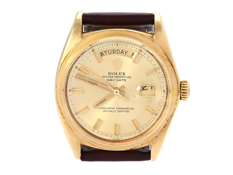 ROLEX, Oyster Perpetual, Day-Date (T Swiss T), Chronometer, "Bark Finish", Ref nr. 1807, Serie nr. 2747663, Cal 1556, Verk nr. DD929125, Boett nr. 1803, herrur, 36 mm, 18K guld, automatisk, plexiglas, dag, datum, defekt, (akut servicebehov), OBS: saknar glasring i guld ("Bark Finish"), läderband, ca 1971,