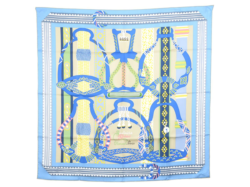 HERMÈS, SCARF, Fantaisie d'Etriers Fantasy, Virginie Jamin, 100% siden, 90x90 cm, multifärgad, blå, grå, gul, rosa, originalkartong. Excellent Condition.