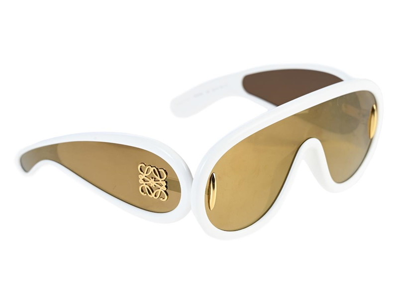 LOEWE, SOLGLASÖGON, Paula´s Ibiza Shield, LW401081, 25G, 140 0 145, 3 I, vita bågar, guldfärgade beslag, mörka glas, kvittokopia från 2024, putsduk, fodral, originalkartong. Good Condition.
