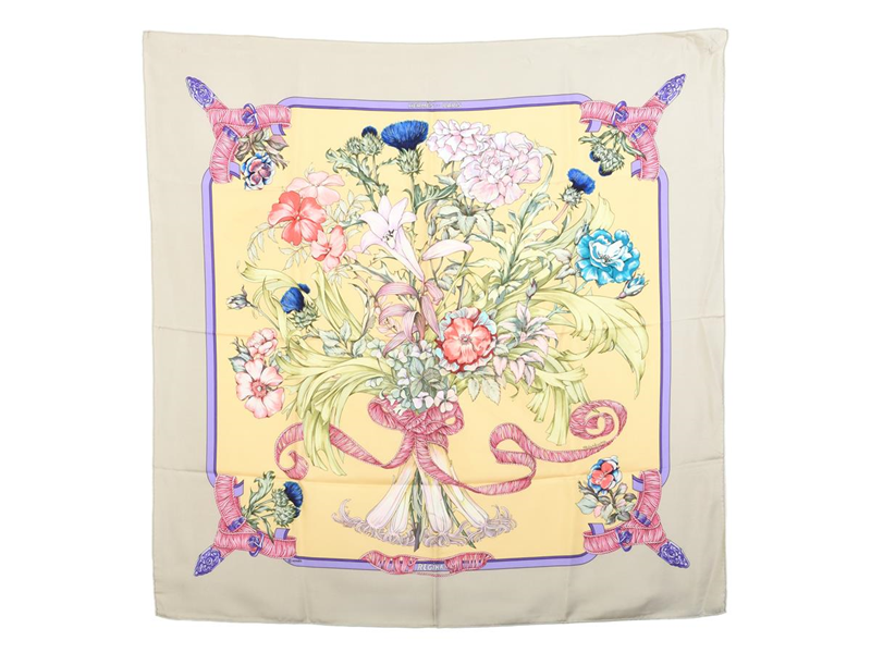HERMÈS, SCARF, Regina, Leila Menchari, 100% siden, 90x90 cm, multifärgad, lila, gul, rosa, grå. Excellent Condition.